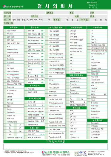 - 기재되어 있지 않는 항목을 의뢰 할 경우 의뢰서 하단부 기타검사항목란에 항목명과 검사방법을 기입해 주십시오.